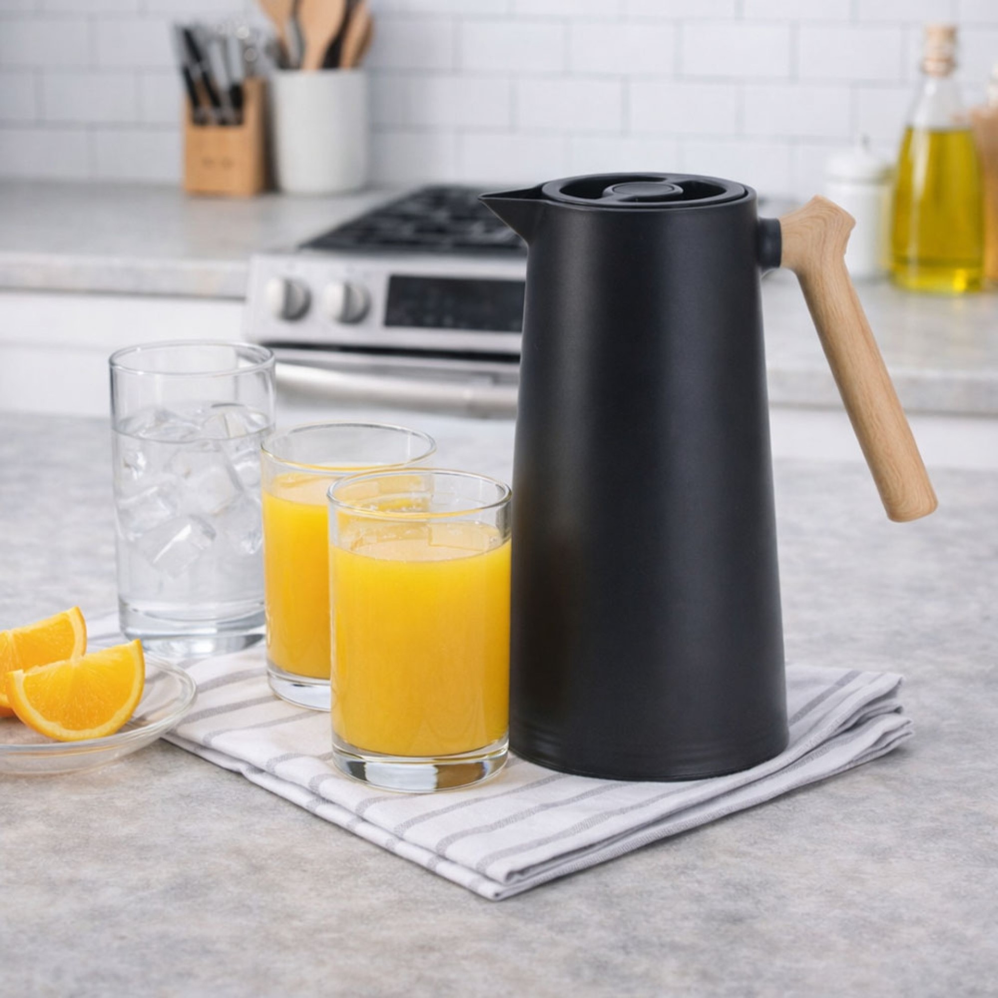 Θερμός κανάτα χωρητικότητας 1 λίτρου, με εσωτερικό γυάλινο δοχείο για αποτελεσματική διατήρηση της θερμοκρασίας. Διαθέτει ανθεκτικό πλαστικό σώμα, πλαστικό καπάκι και εργονομική λαβή με όψη ξύλου, που προσφέρει άνετο κράτημα και κομψή εμφάνιση. Ο δακτύλιος σιλικόνης συμβάλλει στη σωστή στεγανοποίηση και στην αποφυγή διαρροών. Ιδανική για σερβίρισμα ζεστών ή κρύων ροφημάτων στο σπίτι ή στο γραφείο.