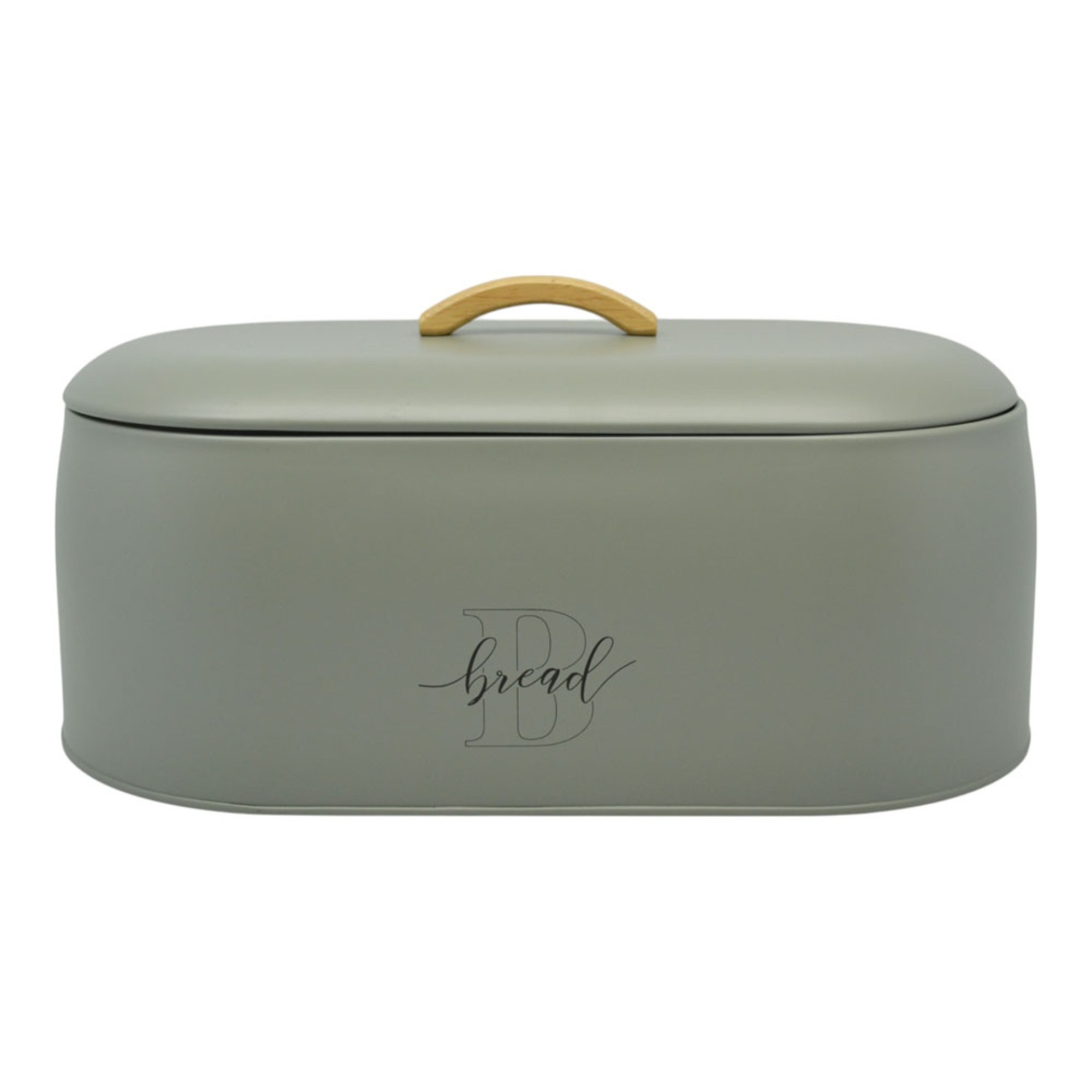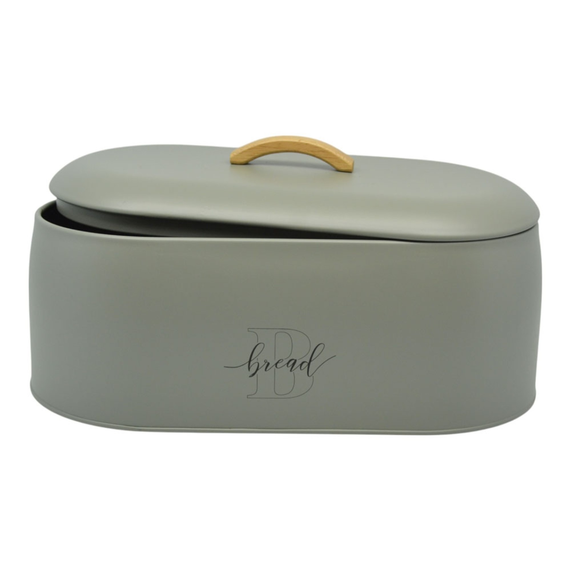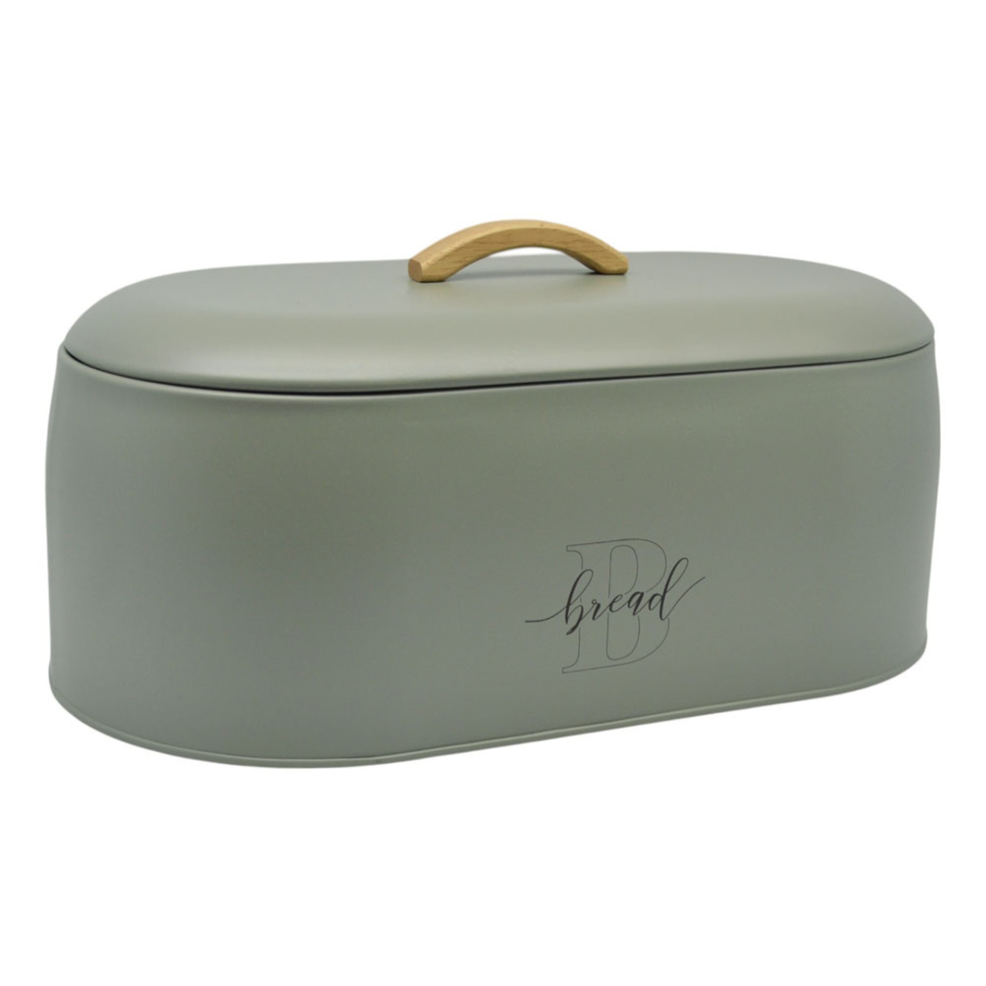 Μεταλλική ψωμιέρα σε λαδί ματ χρώμα με ξύλινη χειρολαβή και διακριτική επιγραφή Bread. Ιδανική για την αποθήκευση ψωμιού και αρτοσκευασμάτων, τα διατηρεί φρέσκα, προστατεύοντάς τα από την υγρασία.