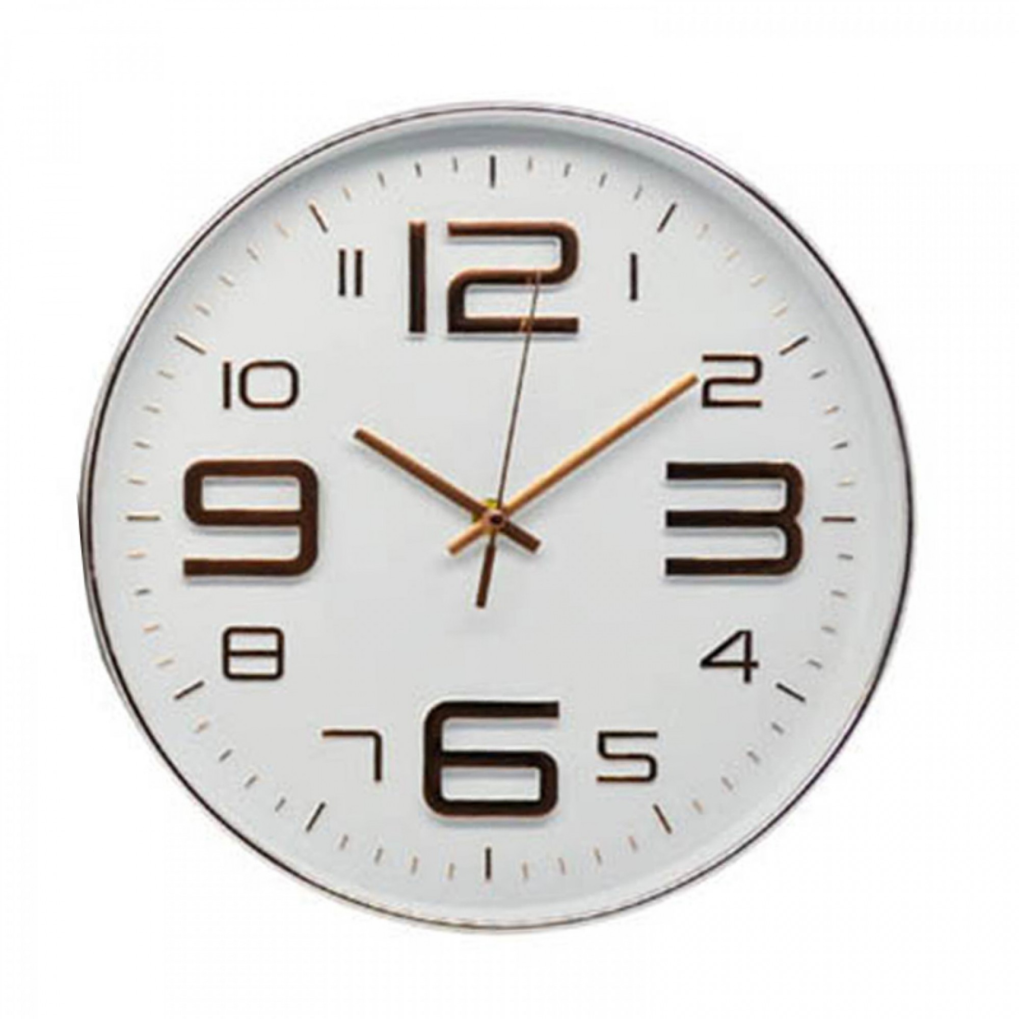 Ρολόι τοίχου με πλαστικό πλαίσιο σεrose gold χρώμα . Διαθέτει άσπρο καντράν με rose gold αριθμούς.